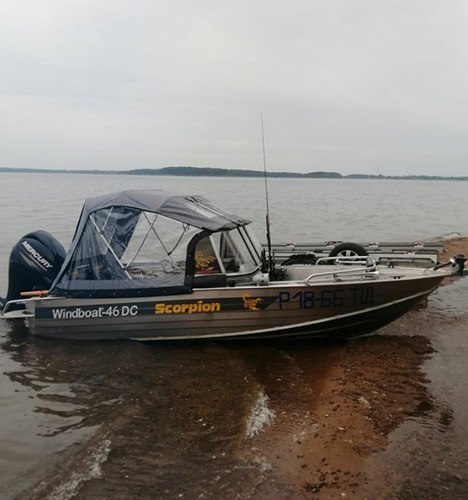 Тент с задней дверью для выхода к мотору, небольшими боковыми окнами и усиленными краями для установки застёжек. Изготовлен из специализированной тентовой ткани Оксфорд 600 повышенной плотности
